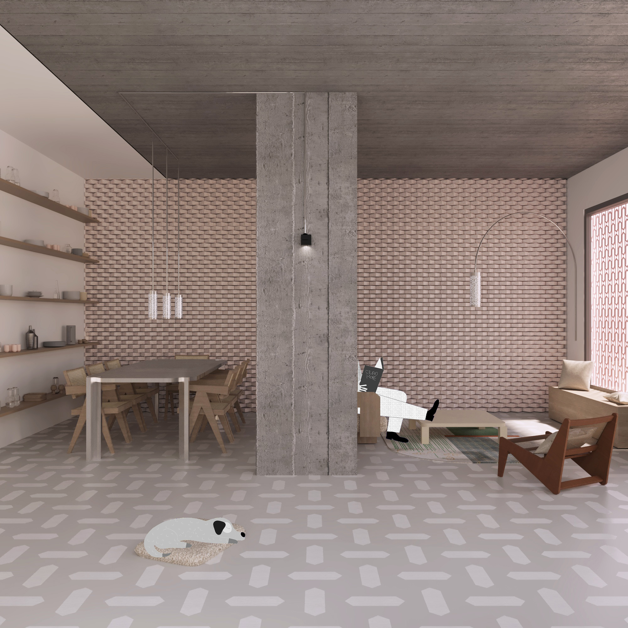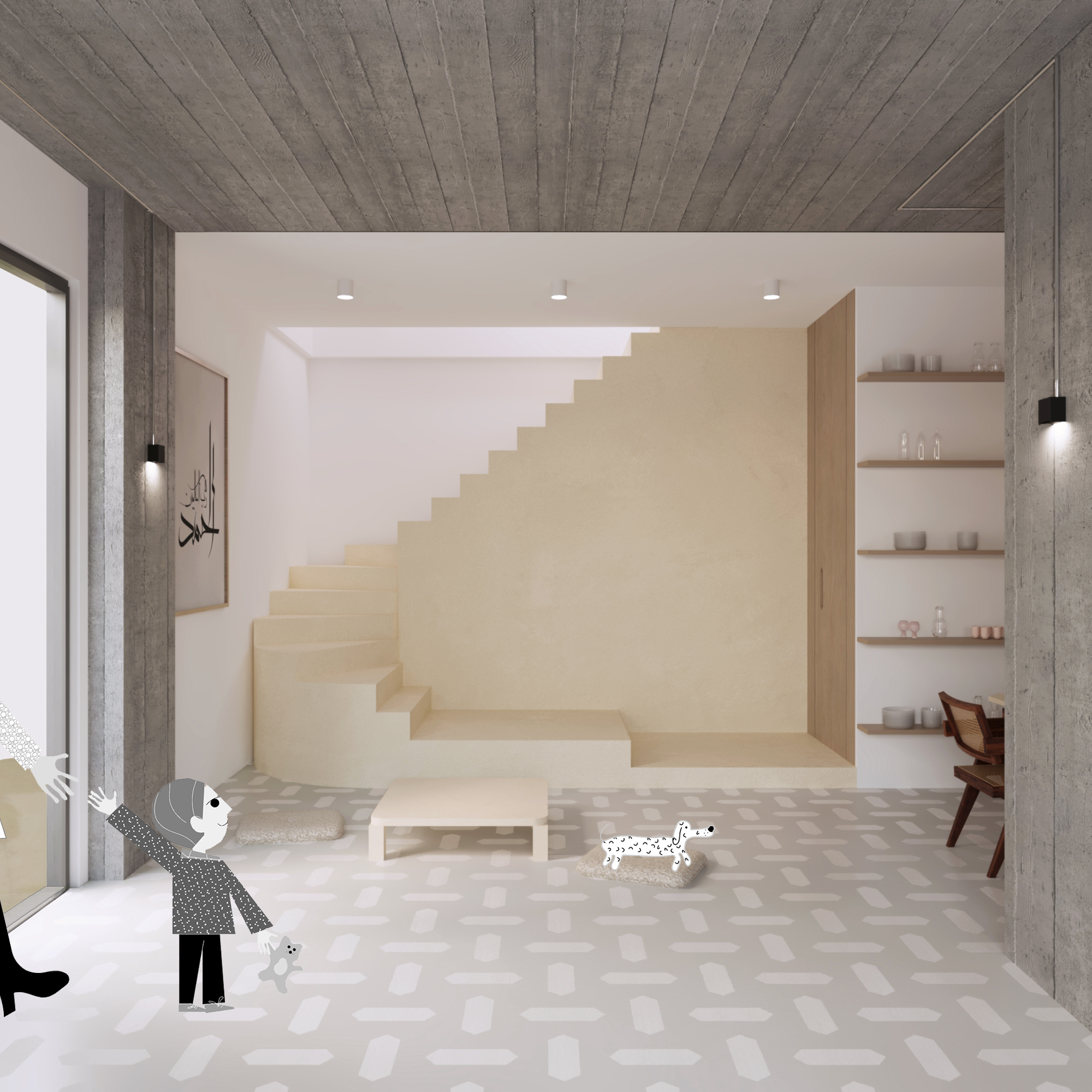 In einem Wohngebiet wird eine Wohneinheit eines Mehrfamilienhaus umgebaut. Hierzu wird die Garage zur attraktiven Wohnfläche mit Gartenzugang umgenutzt und mit der darüberliegenden Wohnung verknüpft. Es entsteht eine großzügige Maisonette-Wohnung über zwei Geschosse mit Wohn- und separat nutzbarem Bürobereich. Das Erdgeschoss ist als Wohn- und Essbereich offen gestaltet. Vorhandene Tragwerksstützen sowie gezielt gesetzte Einbauten wie die Kochinsel zonieren den Raum. Die darüber liegenden Schlafzimmer ordnen sich größtenteils dem bestehenden Layout unter, während für die Bürofläche bestehende Trennwände weichen mussten. Die dadurch gewonnen Rohmaterialien wurden für den Bau des Ziermauerwerks im Wohnzimmer (“Zick-Zack-Wand”) eingesetzt. Diese Wand dient als Akustikwand im Raum, um ein angenehmes Wohnklima zu schaffen. Die Bestandswände wurden ebenso vollumfänglich gedämmt, um die technischen Maßnahmen der Klimaregulierung zu minimieren.