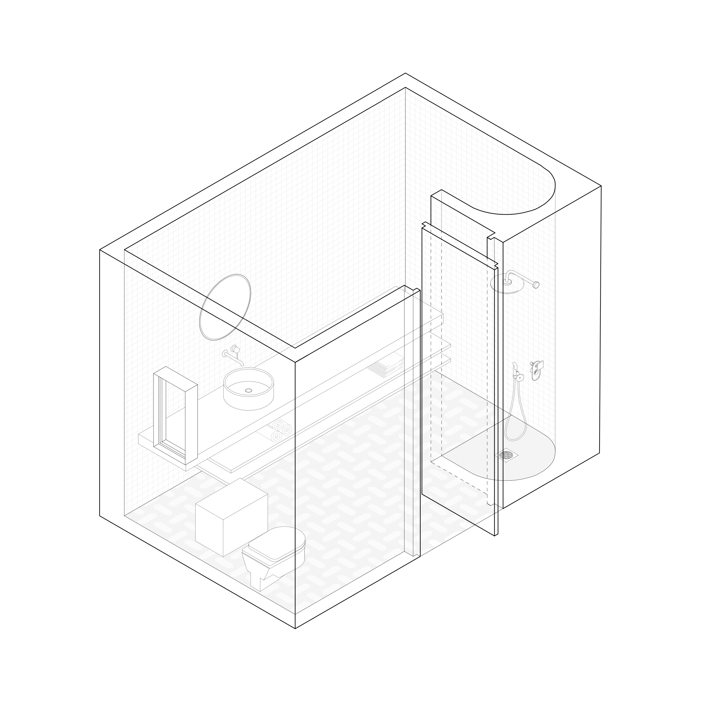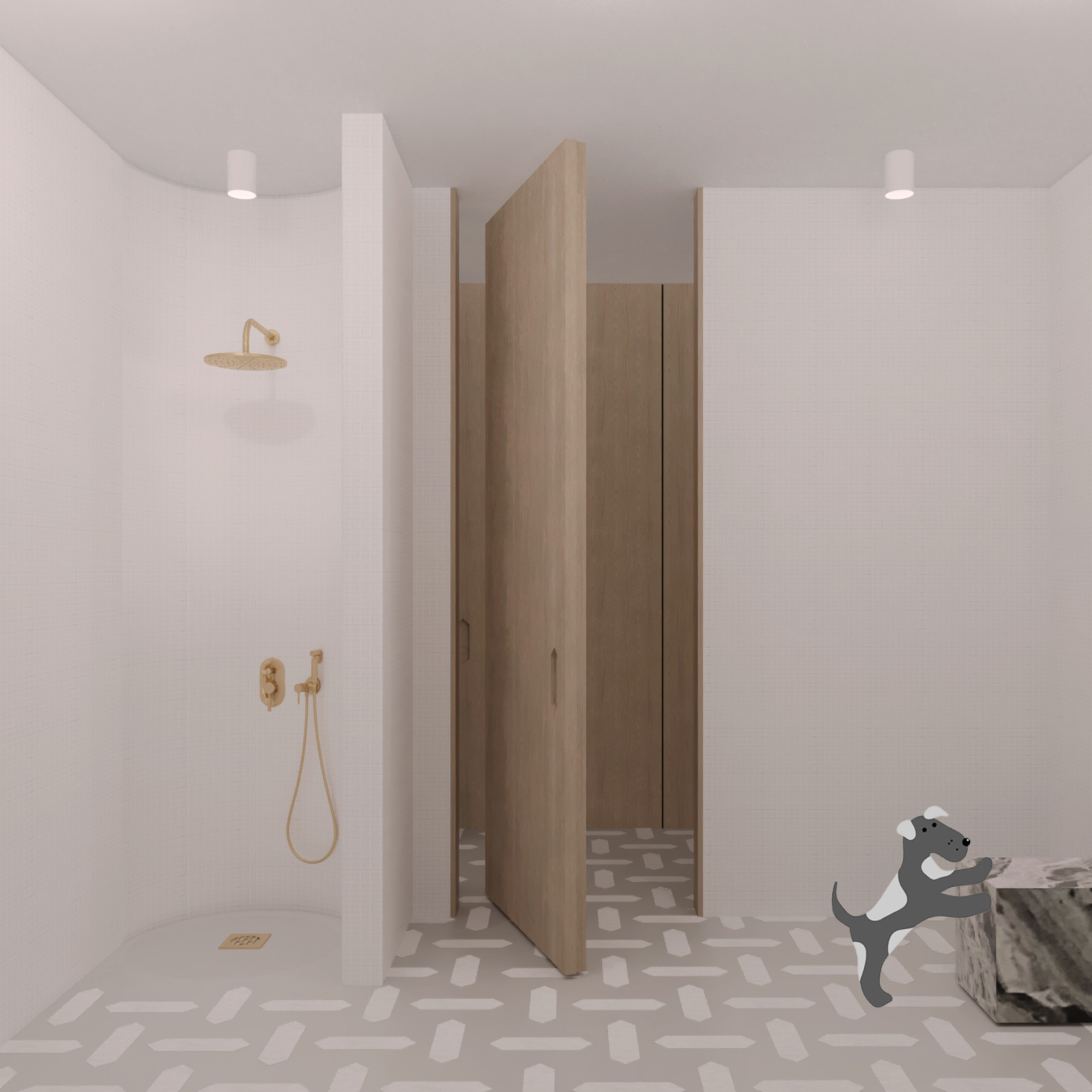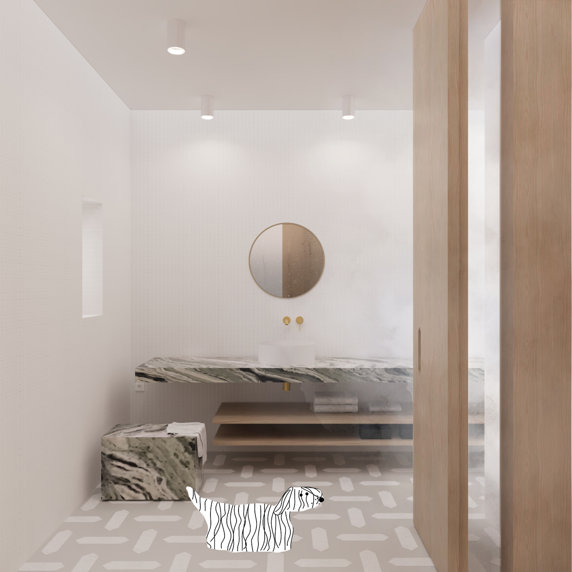 Das bestehende Bad wird räumlich durch die Duschnische erweitert und neu strukturiert. Der ägyptische Marmor, welcher am Bauort ein lokales Material ist, definiert die Ausstattung des Sanitärraumes.