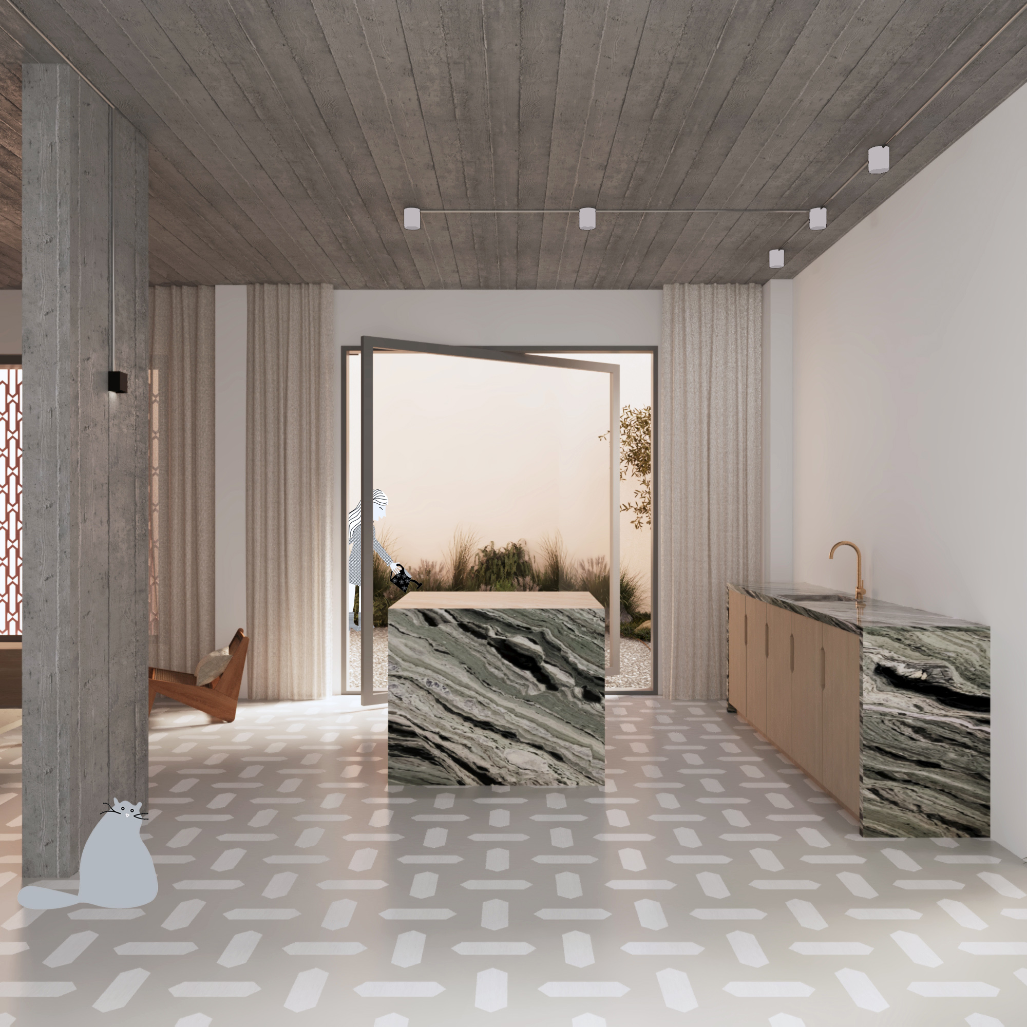 Die Fußböden wurden aus einem traditionellen arabischen Motiv abgeleitet und dieses mit modernen Materialien übersetzt. Die Form/ das Ornament wird aus lokalem Stein in Fliessestrich eingelegt und bildet durch die homogene Farbwahl mit unterschiedlicher Haptik ein spannendes Wechselbild.