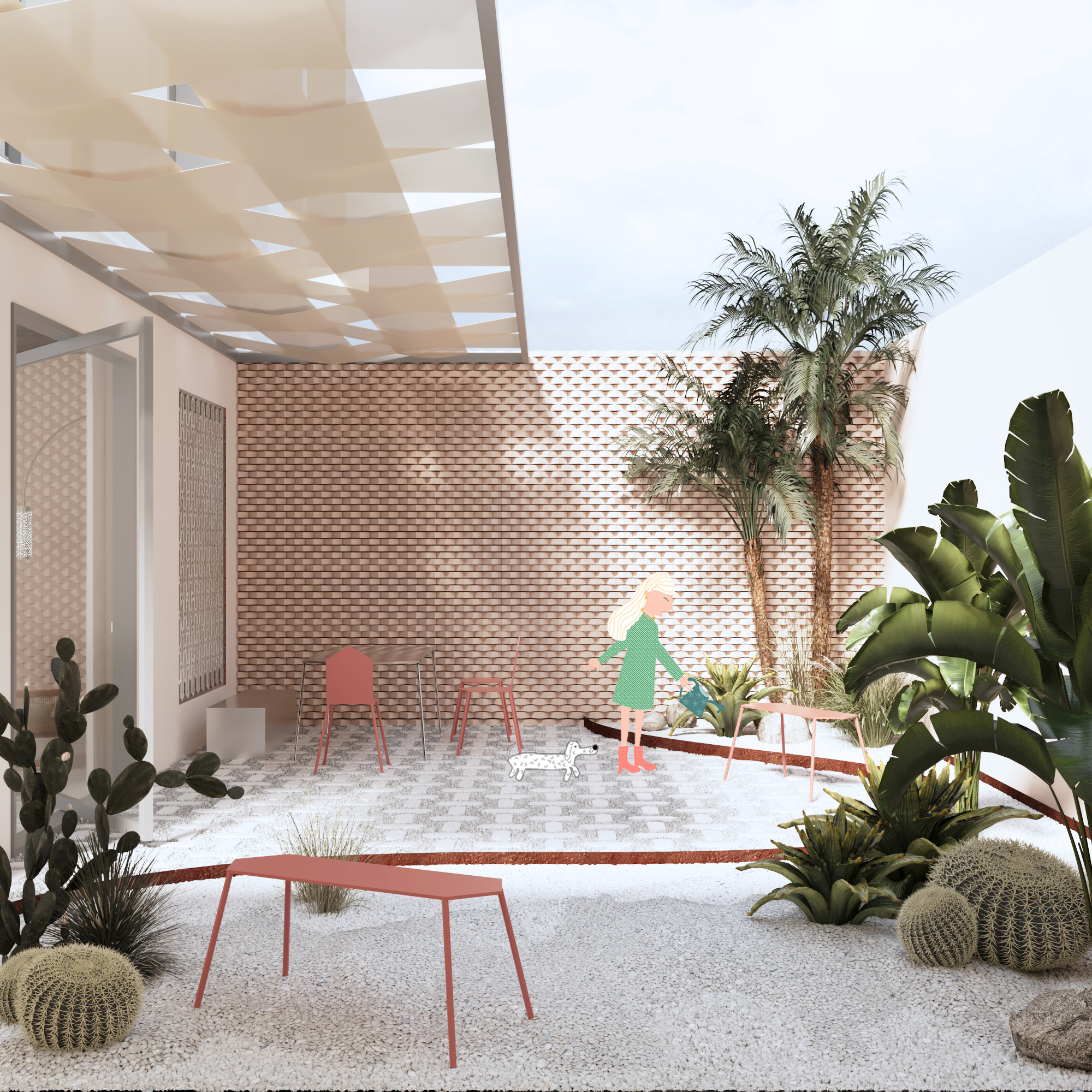 Im neu gewonnene Garten wird Vegetation gepflanzt, welche dem extremen Klima standhält. Oberflächen werden ebenso betrachtet. Angenehmen Schatten spendet die Textilpergola.