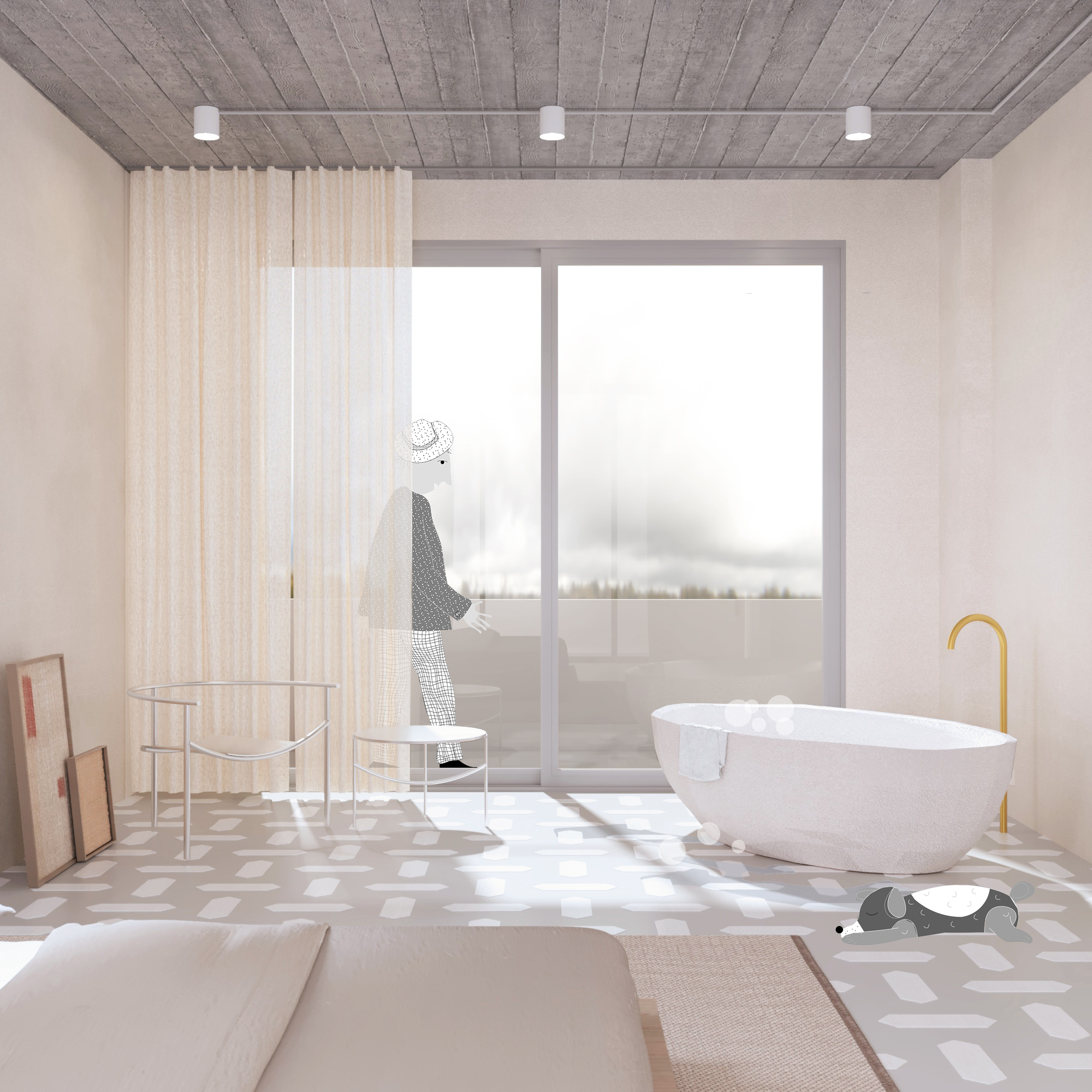 The boundaries between sleeping/dressing/cleaning and bathing are fluid in the master bedroom. The wardrobe defines the room zones as a set element.