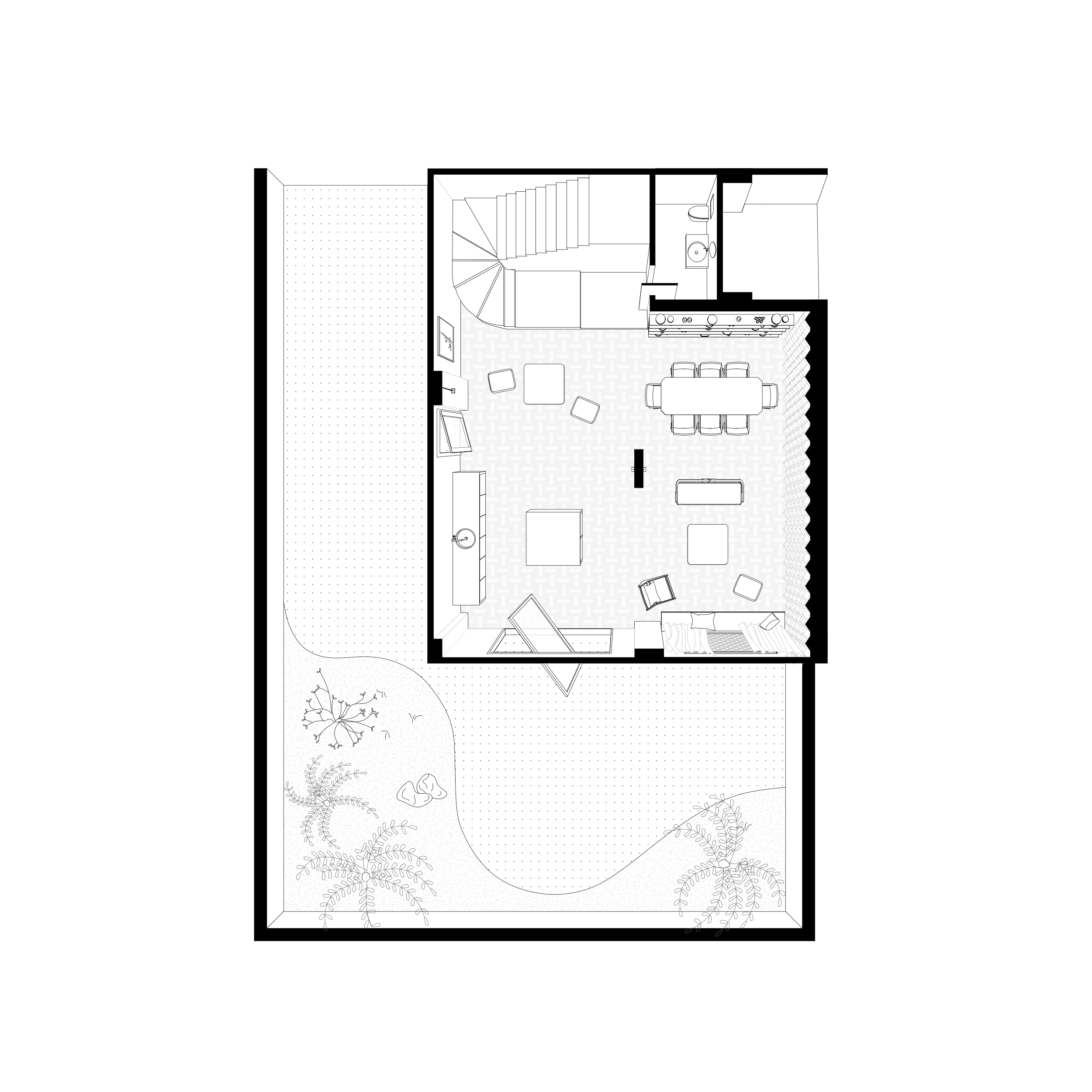 Garden level with residential floor: existing building – black, new intervention – pink, demolition – yellow